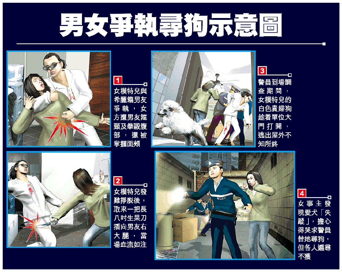 【本報訊】一名身材高䠷的女模特兒,昨凌晨在上環唐樓寓所與希臘籍同居男友,疑為感情及家事問題鬧翻,遭男友以箍頸、拳毆腹及摑面三招「教訓」,痛得她發難掙脫後,取來生果刀插向男友大腿還擊,結果兩敗俱傷被捕。其間,女模特兒發覺心愛貴婦狗「失蹤」,擔心得兩度哭求警員替她尋狗,反而男友右腳染滿鮮血,她卻漠不關心。 記者:李家傑 梁偉權