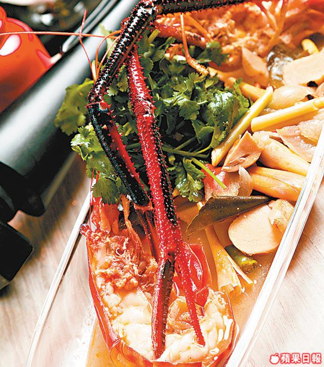 有成5"長的越南皇帝蝦,睇見肉面纖維一梳梳,食落相當彈牙爽口,伴碟是南薑、香茅、香草等配料,泰式冬蔭功湯新鮮熱辣另煲上,雞湯底、香辣得嚟又唔太濃,不會蓋過啲蝦味。