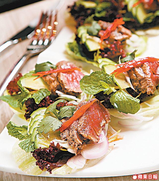 屬美國靚牛肉,將面層燒至微熟,配以青瓜、亁葱、薄荷、紫椰菜等同食;肉汁下漏,唔多落調味已鮮到暈。