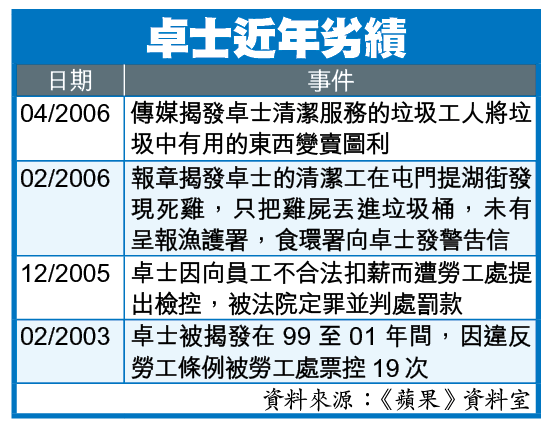 取得04至06年食環署葵青、離島及大埔區清潔合約的卓士清潔服務,於去年12月因不合法扣薪而被定罪。立法會議員李卓人指,根據財經事務及庫務局4月底發出的有關管理措施,外判商如有違反《僱傭條例》、《入境條例》及《強積金條例》而被定罪,五年內投標將不獲考慮,其股東的投標也不應被接納。