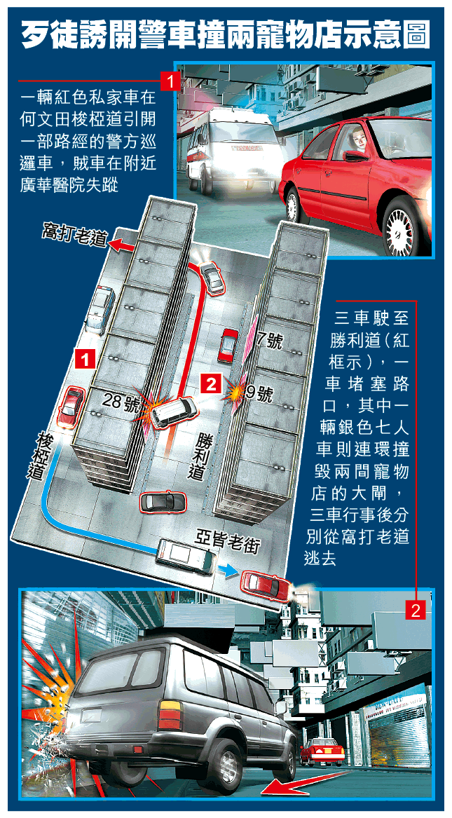 未幾有大廈保安員突聽到巨響,發現姓沈東主兩間在勝利道斜對面開設的寵物店,被一輛銀色七人車倒後及衝前連環撞向大閘,三車事後分別沿窩打老道逃去。