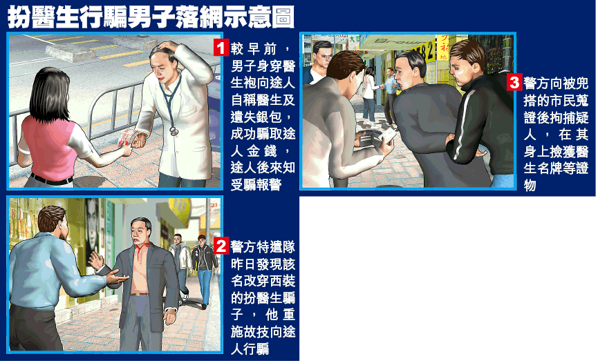 另外,騙徒向另一名男途人自稱是孤兒院職員,亦謂失掉銀包要求借錢,但男途人表示不信他所言而拒絕。警員在成功蒐證後立即採取行動,將涉案男子當場拘捕,並在他身上撿獲一張醫生名牌和樂施會信封。據稱,涉案男子昨日在被捕前,已用同一手法成功騙去一名市民100元。