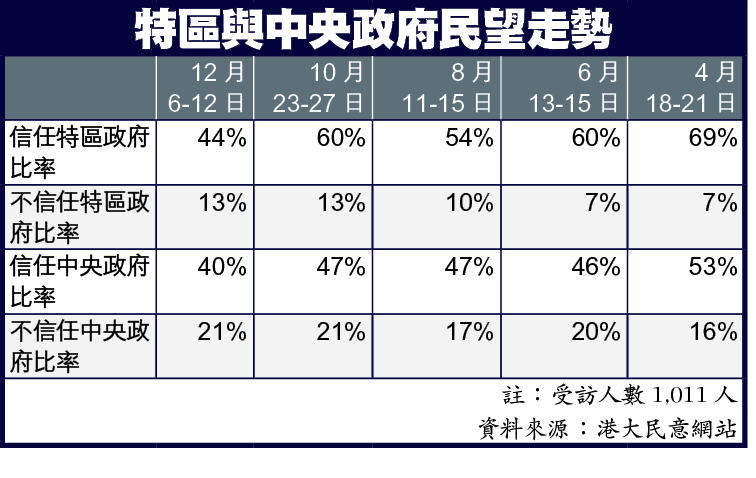 港大民意研究計劃公布特區與中央政府民望最新數字,調查發現市民信任特區政府比率,只有44%,較10月份調查,下挫16個百分點,不但是曾自去年7月就任以來新低點,也是他上任以來,政府民望最大跌幅。同一時間市民對中央政府信任率也下跌7個百分點,低見40%,差不多重返曾蔭權接任特首時的水平。至於市民對特區政府及中央政府不信任比率,則維持於13%及21%水平。