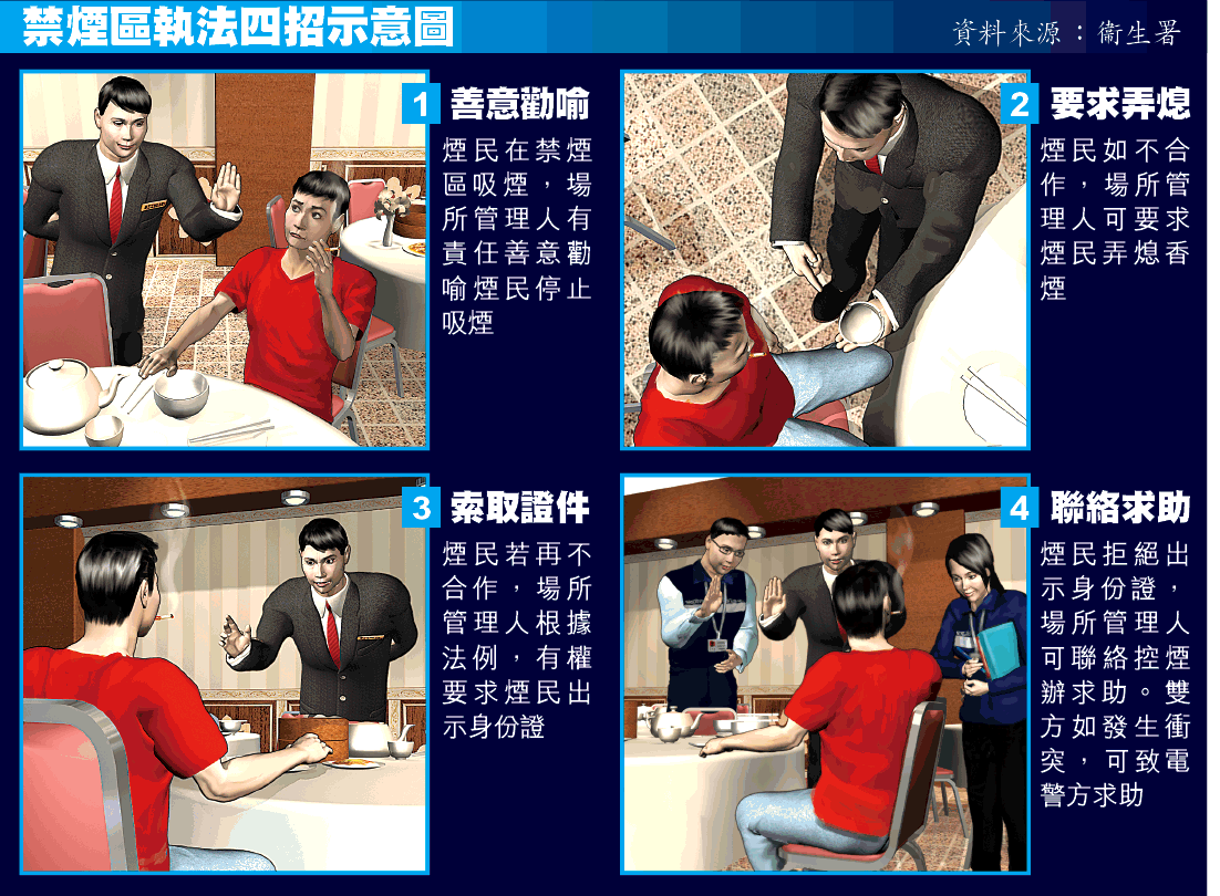 衞生署副署長梁挺雄昨日在記者會公布全面禁煙法例生效後的新措施,控煙辦已向新列入禁煙區場所的負責人,講解可依法獲授權禁止煙民在禁煙區內吸煙。負責人見到違例吸煙者,可採取四招,先勸喻;繼而要求弄熄;若再不合作則要求出示身份證,日後轉交控煙辦;仍拒絕便立即聯絡控煙辦,有衝突則報警。
