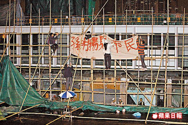 與此同事,約五名男女原來已悄悄爬上地盤的竹棚,並將棚上的部份帆布扯下,其間警方及地盤工人也不加阻止,竹棚上的示威者更如蜘蛛俠般,爬上爬下,後來更拉起寫上「孫明揚見市民」等的橫額。據了解,地盤另一邊的圍板,其實之間有不大不小的空隙,示威者懷疑是趁衝突爆發期間,避過警方防線竄入地盤。團體將於本月17日再舉行集會,爭取保留鐘樓。