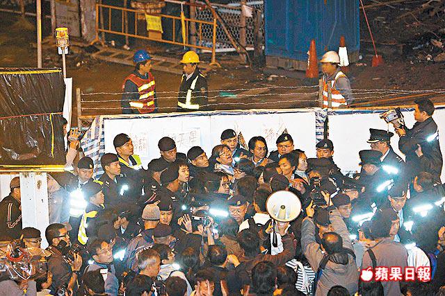 雖然集會人士一度聲言會以和平方式示威,不會有較激進的行動,但於九時半,約百名示威者突然慢慢走向地盤,警方立即上前阻止,現場一度混亂,最後警方以鐵欄圍着約10名示威者,當中包括日前曾示威的朱凱廸、何來、陳景輝等,其餘示威者極為不滿,大聲要求警方「放人」,更幾度拉扯鐵欄,與警方多次發生衝突。