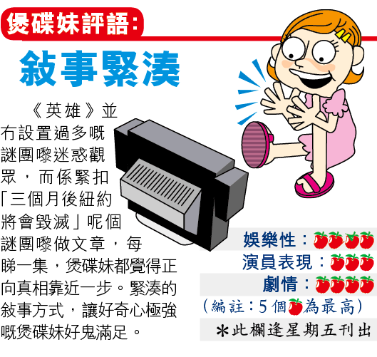 美國NBC電視台早前播映嘅科幻劇《英雄》(Heroes),首集收視直沖雲霄成為No.1,第四集收視總人數已達1430萬人次,創出NBC首播劇五年來嘅最高收視紀錄,力挽該台頹勢。《英雄》講述癮君子和AV女等幾個普通人,發現自己有超能力後,點樣改變世界嘅故事。