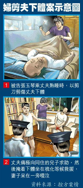警方到場拘捕張,被告警誡下指丈夫有婚外情,令她難過,所以剪其下體,丘即時送院。