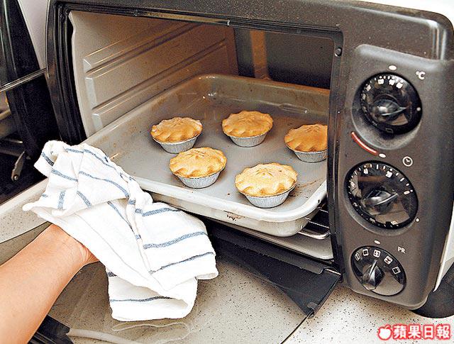 將批皮壓平扣出18個3吋小塊,鋪在2吋半的錫紙杯中,放入餡料,再蓋上餘下的批皮,封好批邊並握成波浪形狀。放入預熱的焗爐以200℃焗10分鐘,取出灑些白糖上面,再焗10分鐘即可。