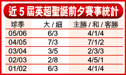 周六一輪是聖誕節前最後一輪英超賽事,數據顯示在對上5屆聖誕前夕的英超聯賽事,開出的總入球多數在3球或以上的場次頗多,46場比賽總共開出24「大」22「細」,其中上屆及前屆便開出6「大」3「細」及7「大」3「細」。