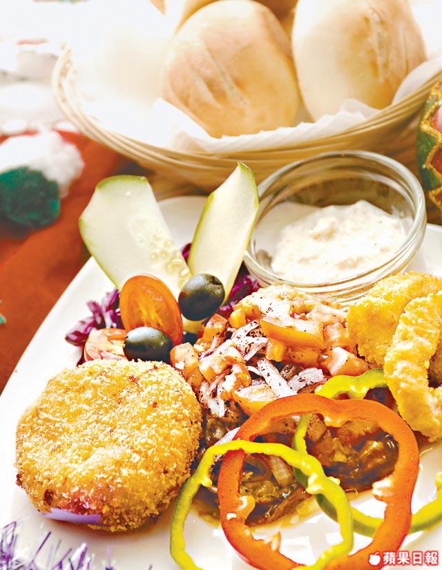 有應節的BBQ火雞串燒、蟹肉椰菜沙律、意式小食和天婦羅,天婦羅有魷魚、蘑菇等,加入少許辣粉更惹味,送酒亦可。