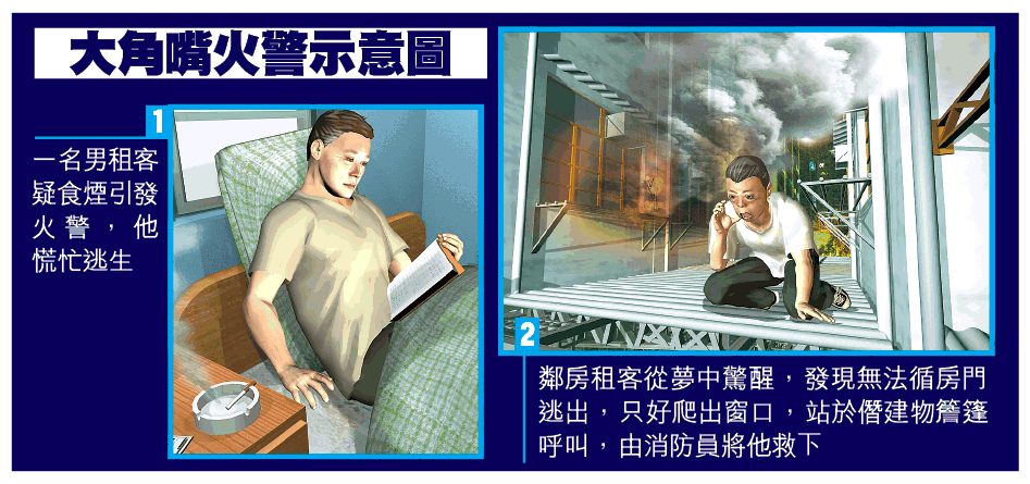 【本報訊】大角嘴菩提街一名租住板間房的男住客,昨晚疑食煙引起火警險被燒死,他在火光熊熊、濃煙沖天突圍逃生,幸只灼傷手臂和撞傷額頭送院,至於鄰房男租客則攀窗爬出後巷僭建物簷篷呼叫求救,險象環生,消防人員到場迅速將他救下,現場和毗鄰唐樓住客狼狽疏散,有阿婆說:「冬至啲飯仲未食完已經要走火警,嚇到我𠵱家隻腳仲震緊。」