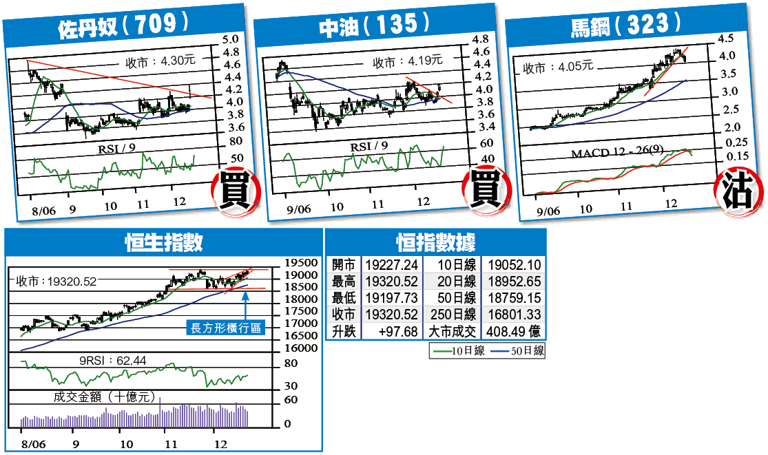 技術指標方面,中線指標DMI中的+DI與-DI糾纏在一起,變化不大,偏穩,MACD牛差距持續擴大,向好,短線指標RSI及STC繼續回升,同屬向好。