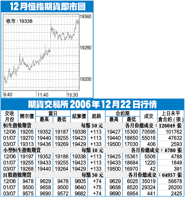 期指以19205低開,其後跌穿前日低位,即時見底急升,以19338高收,升113點,高水18點,日線圖出現破腳穿頭利好形態。