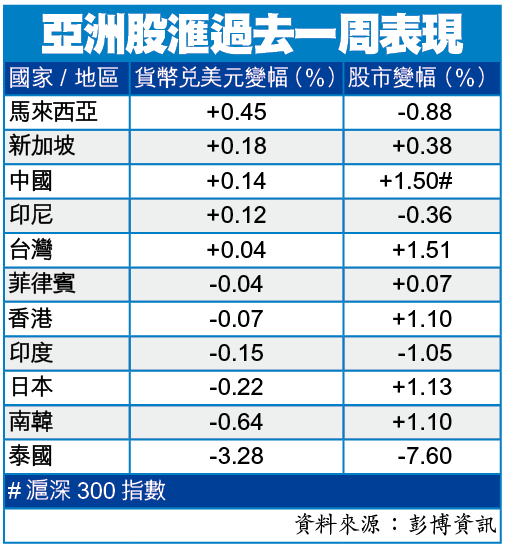 馬元本周累漲0.45%,衝上3.5345,乃98年3月至今新高,為表現最佳的亞洲貨幣。菲律賓披索昨一度升0.55%,攀上49.155的四年半高位;尾段報49.280,全周微跌0.04%。