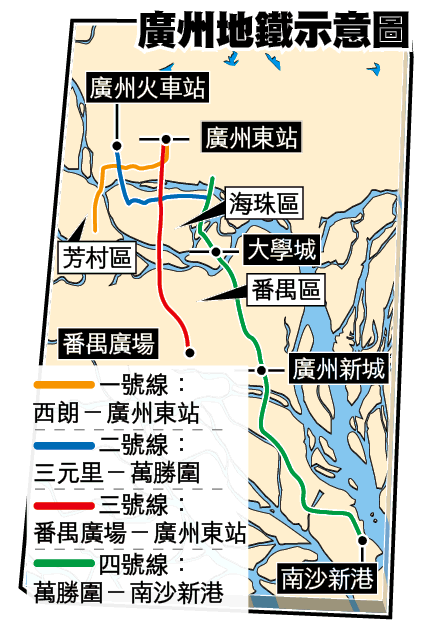 廣州地鐵三號線、四號線將在周六(30日)全線開通。其中,三號線從番禺廣場到廣州市中心只要半小時,番禺的平均樓價因此由早幾年的每平方米約1,000元人民幣,升至約2,000元,翻了一番,而四號線為廣州搭建通海之路,直達南沙新港。