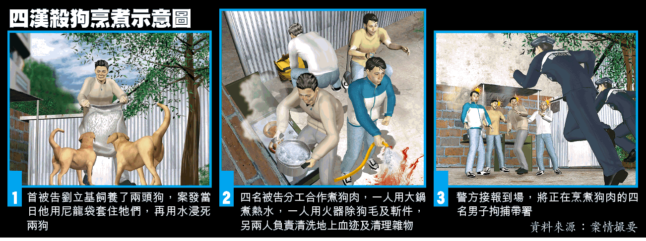 四名被告順序為劉立基、黃勇雄、廖偉康及黃春洪,年齡由40至49歲,他們被判監後隨即申請保釋上訴,獲法庭批准以現金1,000元至2,000元不等保釋以候上訴。控罪指他們上月12日在元朗水蕉老圍一村屋內,屠宰兩頭狗作食物之用。
