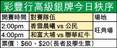 【本報訊】香雪晨曦今午在旺角場舉行的高級組銀牌8強戰,由於受到嚴重傷兵及停賽影響,面對「夫添」上陣的公民難言穩勝。和富大埔賽前傳出兵變消息,今仗能否重演月初以2:0輕取聯華紅牛的戰果成疑。