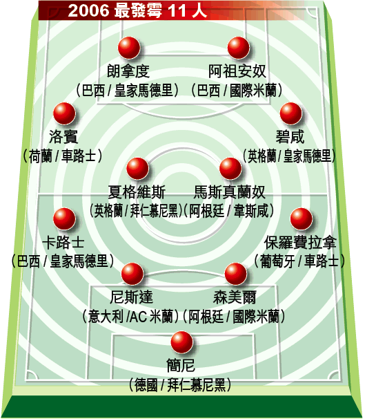 鋒線方面,原想選擇舒夫真高和奧雲,但兩人球場外總算得意。相反,巴西雙煞朗拿度和阿祖安奴卻場內外皆敗興,前者被女友拋棄,後者雖然已為人父,卻不斷與美女、派對扯上關係,形象全失。