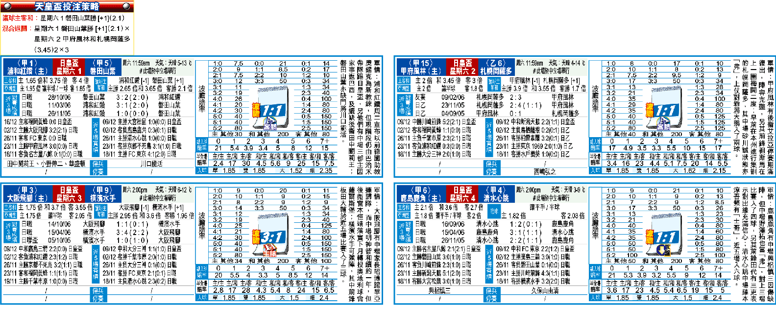 日本天皇盃在周六上演4場半準決賽,其中最有信心為磐田山葉對着殘陣的浦和紅鑽起碼可以保不敗,「讓球主客和」磐田受讓一球,「客勝」可取。