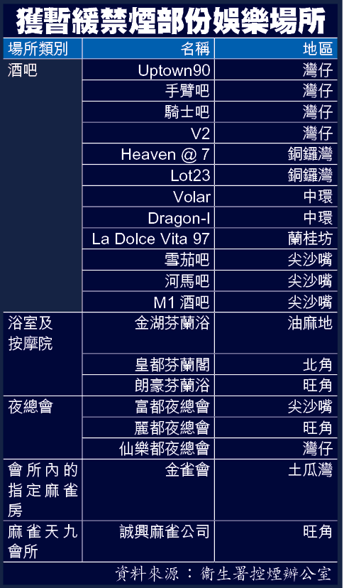 明年1月1日起,所有室內食肆及酒吧等娛樂場所須全面禁煙,但6類合資格的場所,可向衞生署申請延至09年7月才禁煙。衞生署昨日公布,至今約800間場所申請暫緩禁煙,首批獲批場所包括243間酒吧、37間夜總會、31間浴室及按摩院、30間麻雀天九會所及11間會所內指定麻雀房。