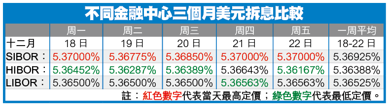 至於香港,由於美元拆息定價剛推出,目前數據僅有數個,難以作準。但可以相信,由於市場高度自由,港元與美元之間可以自由兌換,加上美息較港息為高,銀行同業可得充足的美元供應,所以得出最低的美元定價。倘若美元定價持續以香港市場最低、最便宜,將有助國際企業轉向香港融資,採用本地市場HIBOR作為借貸標準,將進一步利好本港金融中心發展。