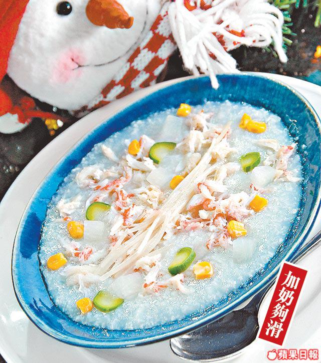 睇個賣相白雪雪就知係唔同一般嘅蟹皇粥。先用蟹殼、蟹箝、魚骨煲粥三、四個鐘,再抽起啲材料,特別加入牛奶,零舍清淡香滑,最後加上蟹肉,即鮮甜又軟滑。