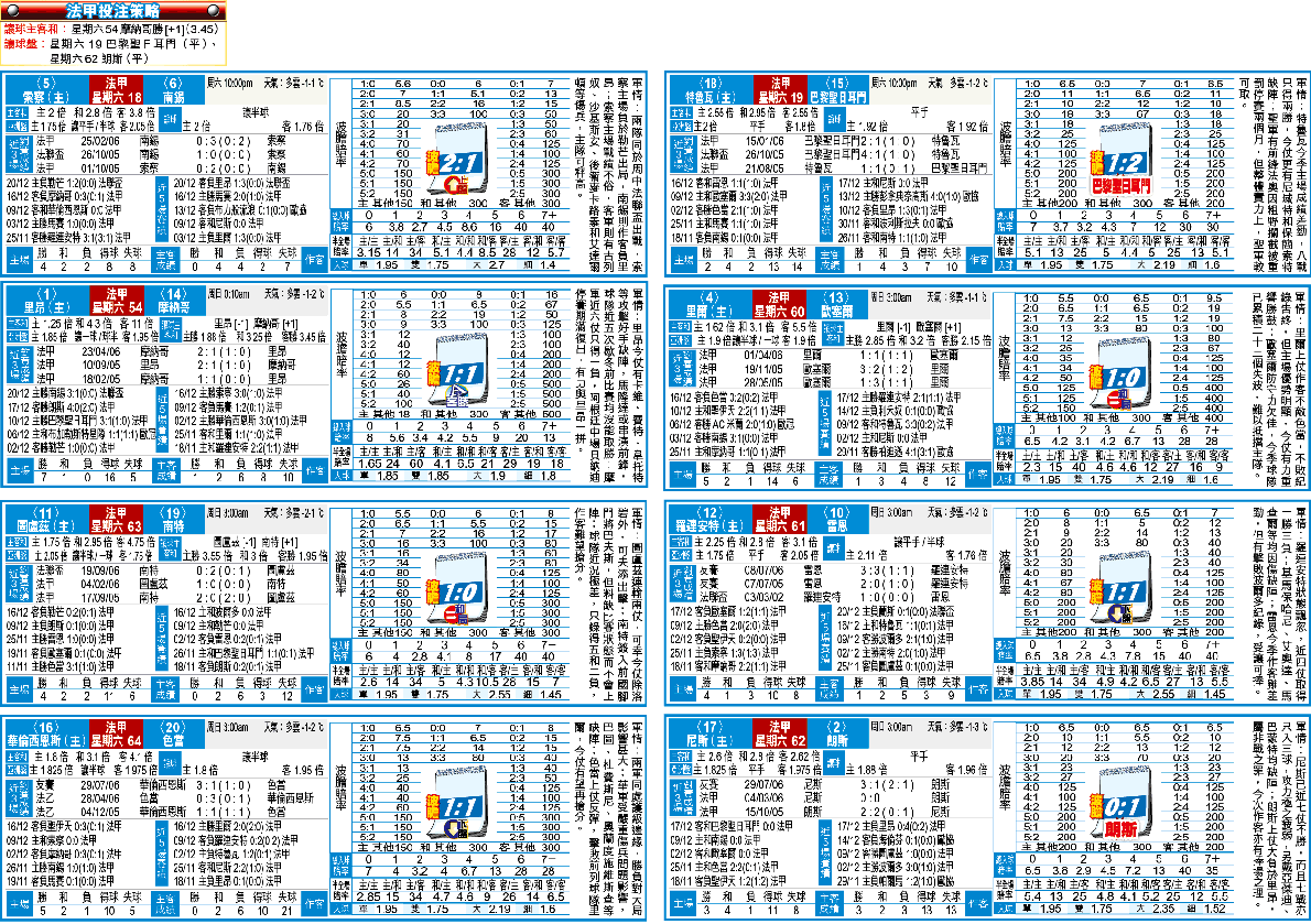 翻查往績,近季歇冬前法甲聯賽均頗利客軍,以上季為例,客隊取得4勝2和4負,不敗率尚可;巴黎聖日耳門人腳不差,近期作客亦多不敗,特魯瓦近3仗主場聯賽已不勝,難靠;另外朗斯作客尼斯,朗斯有足夠休息,可作客挫近7場不勝的尼斯。