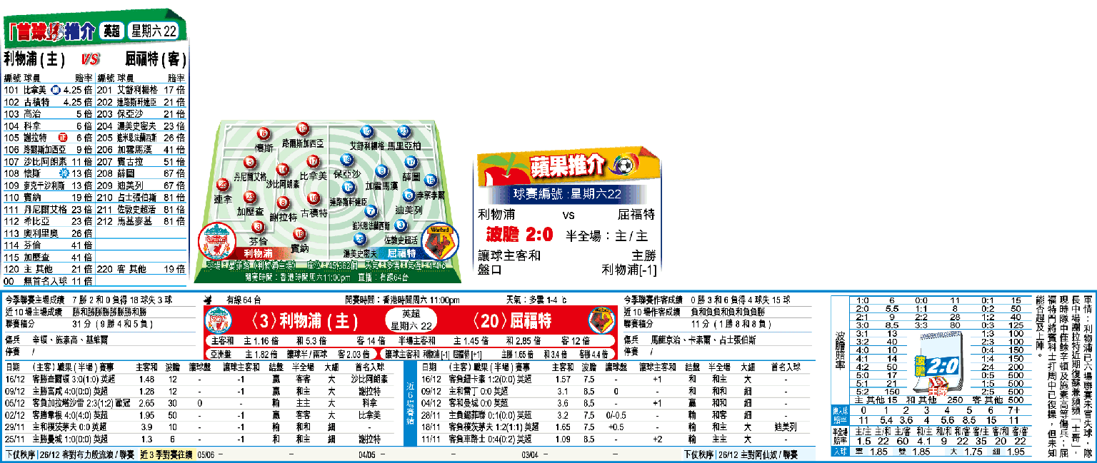 利物浦挾聯賽3連勝走勢,周六英超在晏菲路主場撲擊榜尾屈福特,以紅軍近期固若金湯的防守,加上主W1.16倍投注乏味,不如吼利記不失球波膽還化算,屬「坐2望3」格局。(球賽編號:星期六22;有線64台今日11:00pm直播)