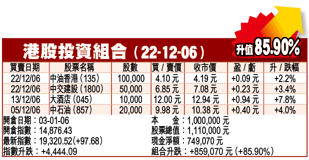 油價續升嘅情況下,中油香港(135)高開,即時掃入都有唔錯利潤,短期目標4.27元,到位先沽一半,破唔到頂就可能先出現整固。中國交通建設(1800)唔算開得好高,亦按策略買入,睇呢隻股嘅買賣盤路幾有趣,澳洲佬成朝喺度收貨,責住球幾貨又逐少逐少買盤擺出嚟買,做到咁明顯咪仲難收貨?