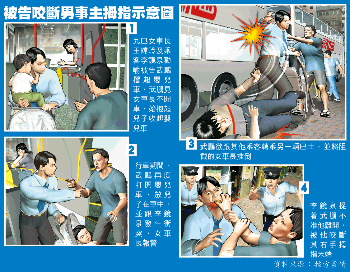 事發於今年5月26日,被告於上水太平邨攜子登上一部273A路線九巴,初不聽女車長王嫦玲(45歲)及男乘客李鏡泉(58歲)勸喻摺起嬰兒車,惟見女車長不肯開車,遂抱起兒子收好嬰兒車。行車期間,被告跟李發生衝突,又再度打開嬰兒車,將兒子放在車上,女車長停車報警,被告欲跟其他乘客轉乘另一輛巴士,遭王阻截,被告兩度將她摔跌,又用手捉着李,咬斷李的拇指指尖,斷指無法駁回。