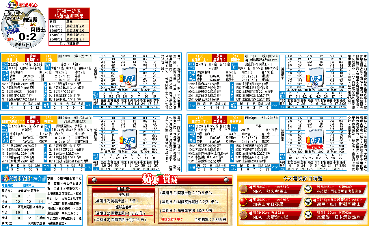 近況回升的阿積士在周日平安夜的荷甲聯到訪維廸斯時,為免被榜首雙雄燕豪芬及阿爾克馬爾進一步拋離,必拼無疑,單W極穩,更可以敲「讓球主客和」讓一球的阿積士「客勝」。(球賽編號:星期日2;無綫收費電視26及now826台今日7:30pm直播)吾中