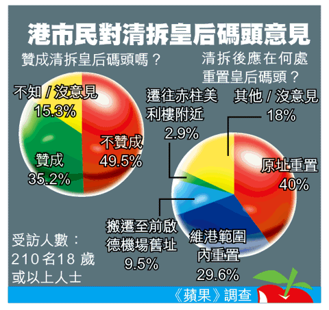 本報昨日透過音頻互動電話,成功訪問210名年滿18歲的本港市民。調查結果顯示,近半受訪市民反對清拆皇后碼頭。四成認為即使因工程要暫時拆除,亦要在原址重置,近三成認為應於維港範圍內重置。