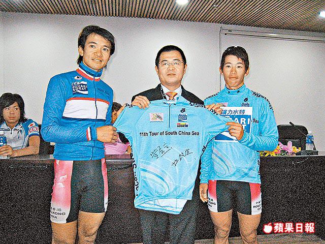 阿寶(左)及林啓俊(右)昨日將一件簽了名的藍色戰衣贈送給佛山站贊助商──網通周先生。