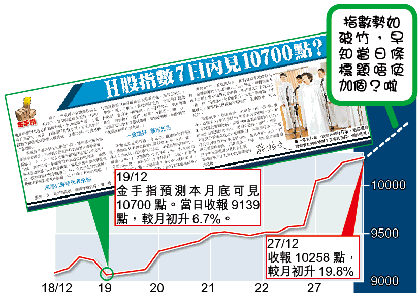 不過,大家寫信來之前,我問大家一句:「你覺得個市仲有得分析咩?如果我叫你唔好買、唔好入市,你會聽我話咩?」呢個大升市,特別係國企H股指數,已經到差唔多高潮,不過最弊係男性高潮,亢奮完就好快會平復,甚至會瞓覺,叫極都唔醒。喺12月19日,當時H股指數大約9139點,12月剩下七個交易日,我曾經同大家講過,市場氣氛令我相信H股指數極有可能學03年咁,喺12月一個月內升25%,H股指數就會升到10700點。計埋今日,仲剩兩個交易日,大家不如將疑慮盡釋,狂歡埋佢!跌市出年先至理!