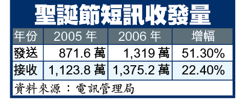 事實上,今年平安夜晚上11時至翌日聖誕深夜12時的25小時內,本港無線電話用戶共發出及接收近2,700萬個短訊,較去年分別升兩成至五成,不少用戶要數小時後才收到短訊。