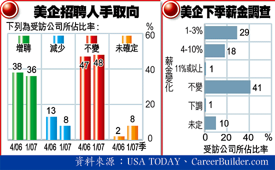 據美國報章《今日美國》(USAToday)及網站CareerBuilder.com於11月17日至12月11日進行的一項網上調查顯示,受訪的2627名人力資源管理層當中,36%表示公司有意在未來3個月增加人手,較過去3個月擬招聘的比例38%為低。