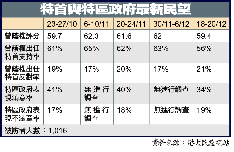 不過,香港市民對曾蔭權有完全不同評價。港大民意網站最新民調顯示,特首曾蔭權評分跌破60分關口,只有59.4分,為上任新低,市民對曾出任特首支持率也跌破六成,只有56%,較上次調查下跌七個百分點,滿意政府表現的更只有34%,下跌六個百分點,當中不滿意政府在民主及民生表現的受訪者,分別有35%及34%,是曾上任以來首次多過滿意者比例。