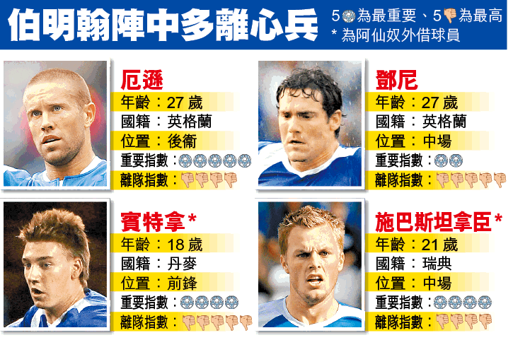 伯明翰近月亦發表聲明,由於鄧尼周薪過高,有傳會以100萬鎊(約1,500萬港元)將其賣予前球會布力般流浪。賓特拿與施巴斯坦拿臣同是阿仙奴外借球員,尤以前者更成近期轉會風頭躉,連AC米蘭及里昂均有意收購,惜被阿仙奴拒絕。但賓特拿揚言會返回阿仙奴力爭正選,故下季留隊機會不大。施巴斯坦拿臣則表明不想外借別會,望在英超聯企穩陣腳。文:畢傑