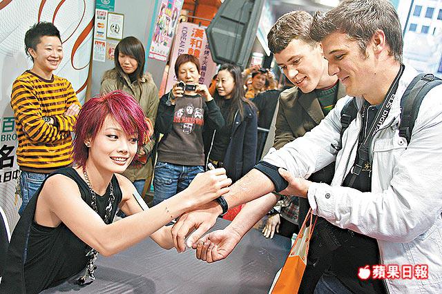 容祖兒昨日在鬧市舉行簽名會,令旺角迫得水洩不通。為了見明星一面,fans可謂各出奇謀,昨日就有兩名外籍男士肉緊地在人群中騎膊馬睇明星影相,此舉更令二人成功突圍而出,獲唱片公司工作人員邀請他們上簽名台與祖兒近距離接觸。雖然兩名外籍人士沒有買祖兒的新碟,但祖兒仍大方地在他們的手臂上簽名,令現場fans羨慕得大聲起哄。
