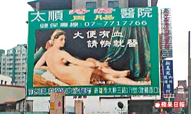 「大便有血,請快就醫」,法國巴黎羅浮宮珍藏的名畫《宮女(TheGrandOdalisque)》的裸女主角,早前被台灣高雄專醫痔瘡的太順醫院盜用為廣告女角,且「被屈」大便有血,百辭莫辯,引起網民關注。