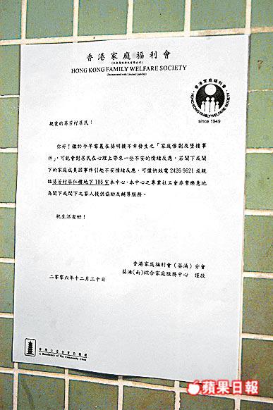 【本報訊】葵涌葵芳邨倫常命案令人歎息,但原來男死者早在本月初已就婚姻問題主動向受政府資助的家庭福利會求助,由於社工認為個案無即時危機,因此安排本周三才進行會面;可惜未及第二次見面,慘劇便告發生。有關注婦女團體直指家福會在處理這類高危個案時明顯敏感度不足。本報記者昨以求助人身份向家福會求助,但職員未有汲取血的教訓,竟打發記者公眾假期後才再來,嚴重缺乏危機感。 記者:盧文烈 冼偉倫