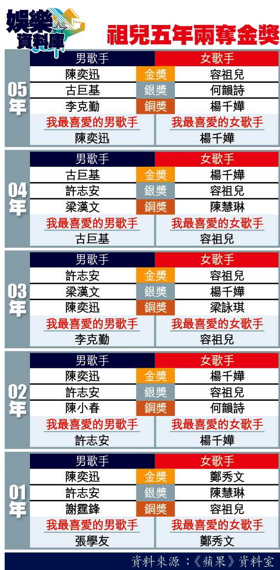 楊受成見爭取「我最喜愛的女歌手」無望,惟有向叱咤女歌手獎埋手,前日便相約俞琤見面,在灣仔福臨門飯敍講數,據知楊受成扭盡六壬,使出三寸不爛之舌游說俞琤讓祖兒捧金獎,至於俞琤則支吾以對,並未有確實答覆。