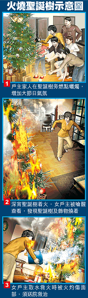 至昨晨一時,放於聖誕樹旁的蠟燭疑被大風吹倒,火屑燃着聖誕樹旁的雜物起火,最後連聖誕樹也被波及冒出大量濃煙。女戶主被濃煙嗆醒起床查看發現聖誕樹及樹旁雜物燒着,立即致電報警及自行用水企圖將火救熄無果,反被火燒傷臉部、手及腳部,慌忙負傷與家人逃離火場。