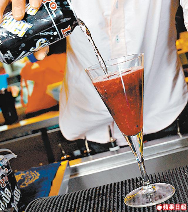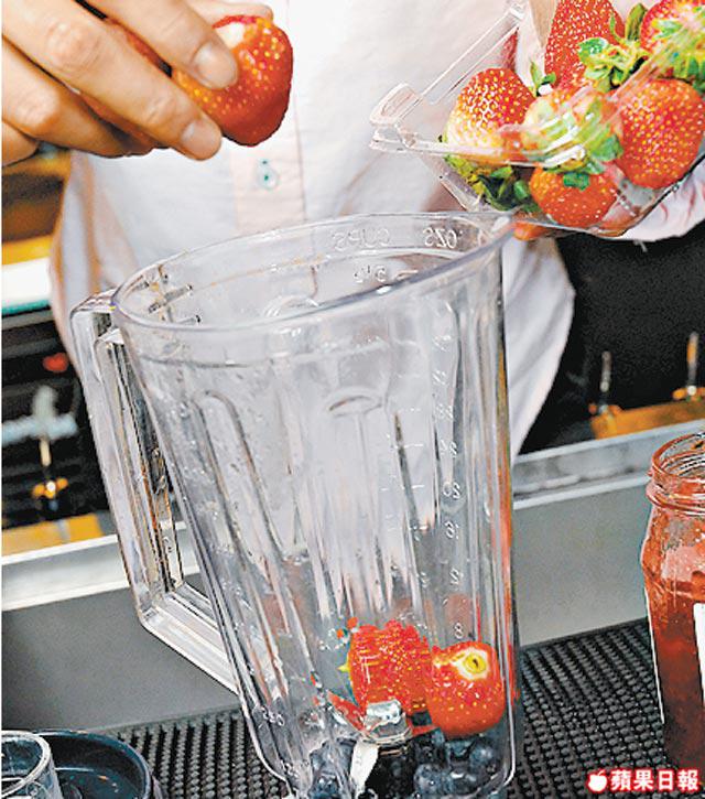 做法︰先將草莓及藍莓洗淨,放入攪拌器,加入草莓果醬,攪拌約1分鐘;把1安士混好的果醬放入調酒器,加入紅酒搖勻後倒出,最後倒入梳打水即可。
