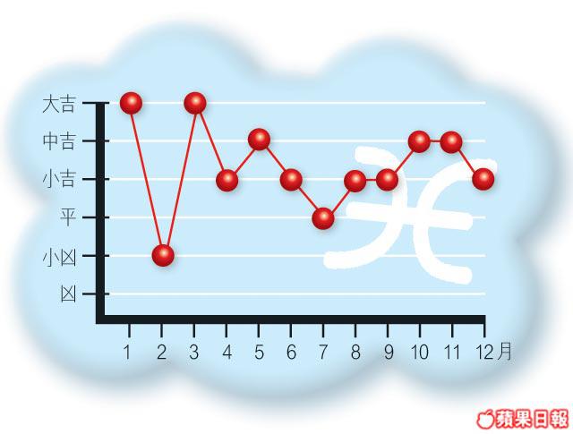 財運:豐收的一年,只是4月至7月有小小阻力,記着多聽取別人意見,問題自會迎刃而解。12月中,宜開始減少投資活動。