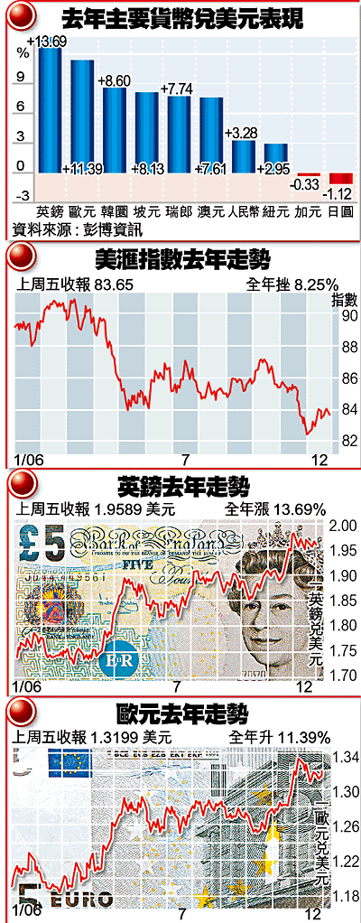 另外,由於歐洲央行過去1年積極加息,歐元兌日圓交叉盤上周五創下157.18的歷史新高,收報157.13日圓;全年累計漲12.65%,是歐元在1999年面世以來最勁。歐元兌美元在06年累積上升11.39%,上周五收報1.3199美元。基於英國息口有望追貼美國,英鎊全年漲13.69%,上周五收報1.9589美元;英鎊在06年12月初直迫2算,高見1.9848美元,是1992年9月中以來最高點。