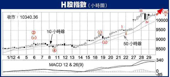 前兩周本欄指出,H股指數今個升浪最少見10100/10400,在當時來說是相對「樂觀」的估計,然而H指於上周3個交易日急升850點,已經一步到位,並且如上周所言,會略為升破10400才現調整。