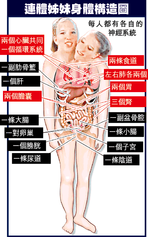 美國明尼蘇達州有一對孿生姊妹,不止同心,而且同身。她們各有一個頭,卻共用一副身軀,一人負責控制一邊的手腳,一起踏單車、游泳、打棒球,甚至駕車。醫生本來斷定她們只有一日命,奇迹是她們快快樂樂活了16年,現在過着百分百的少女生活。