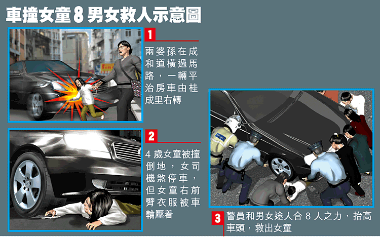 女童被右前臂的衣服被平治房車右前輪壓着,她驚慌哭泣,外婆一時間不知所措。一名姓李交通部警長駕電單車途經現場,上前協助;兩名軍裝及便衣警員連同姓張的士司機上前協助,連同其他三名男女途人,合八人之力將平治房車車頭抬高,拖出女童,並送律敦治醫院治理。女童只擦傷手和面部,稍後已離院。